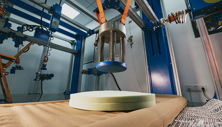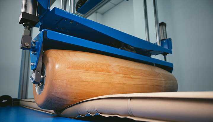 140kgのローラーをエアーマット上で数千回転がし、人がエアーマット上で転がる動作をシミュレートして、膨らみやその他の現象が発生するかどうかをテストします。