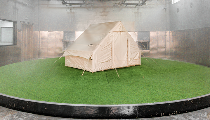 テントを中央の昇降および回転プラットフォームに置き、さまざまな強度の 360 度の風と雨のシミュレーションテストを受け入れ、風と雨の強度レベルを徐々に上げて、テントの極端な風と雨の抵抗をテストします。
