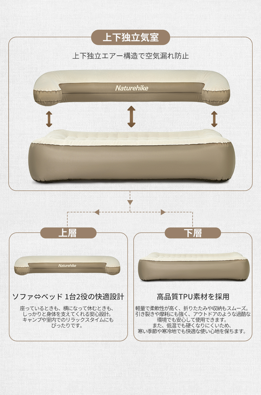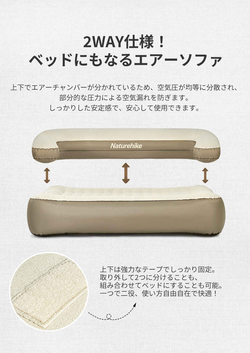 リラックスしたい時はソファ、寝転びたい時はベッドに―― たった1秒、背もたれを外すだけでカタチが変わる! アウトドアでも室内でも活躍する、進化系エアソファが登場! 空気量の調整も不要。パーツを付け外すだけの簡単操作で、ソファ・ベッドの2WAY切り替えが可能。 映画鑑賞や読書タイムにはふかふかのソファモード、疲れたらそのままベッドモードへ。 シーンに合わせて変化するこの快適さ、一度使ったら手放せません。 キャンプ・ピクニック・自宅リビング・来客用にも最適。 まさに“くつろぎ”を持ち運べる、新感覚のエアファニチャーです。