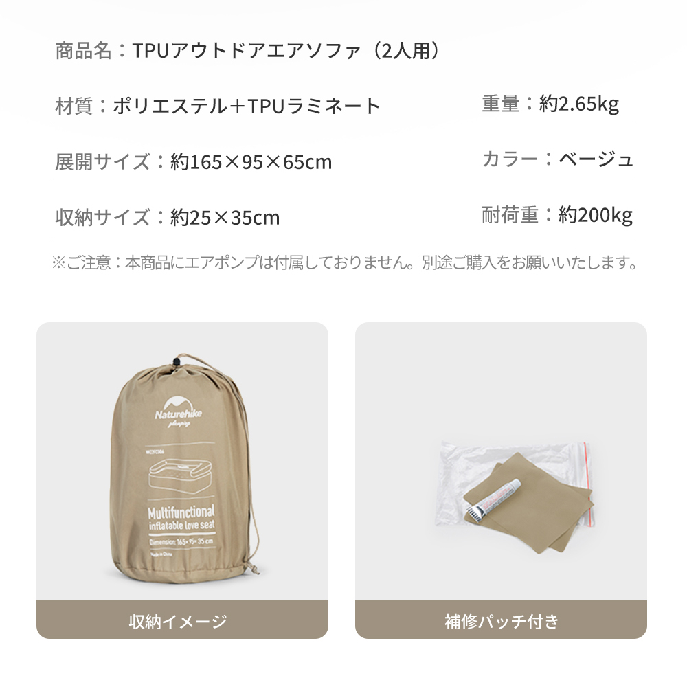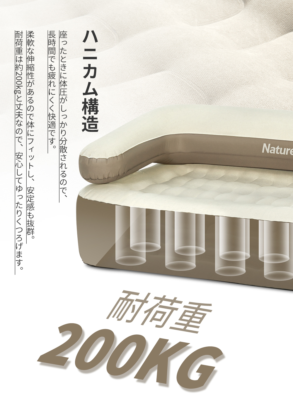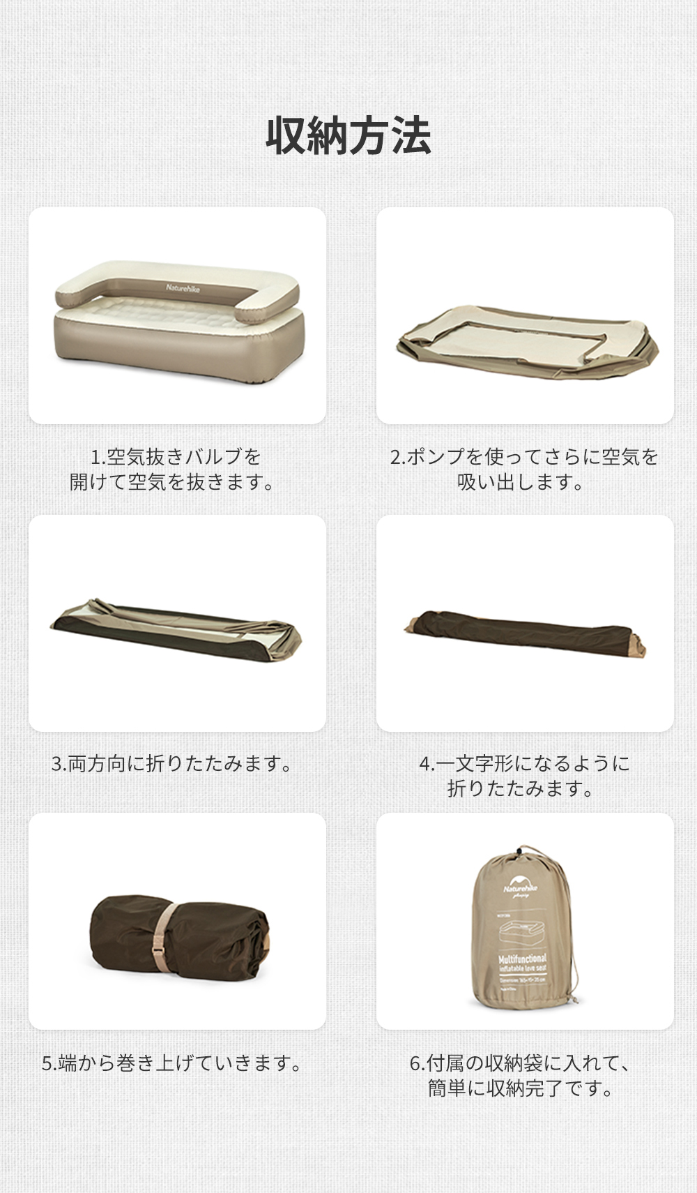 1、新品のエアーソファは、空気を入れた後、8~12時間ほど置いてからのご使用をおすすめします。 内部の補強テープや縫い目が馴染むまで、時間が必要です。初めの2日間は、空気をパンパンに入れすぎないようご注意ください。