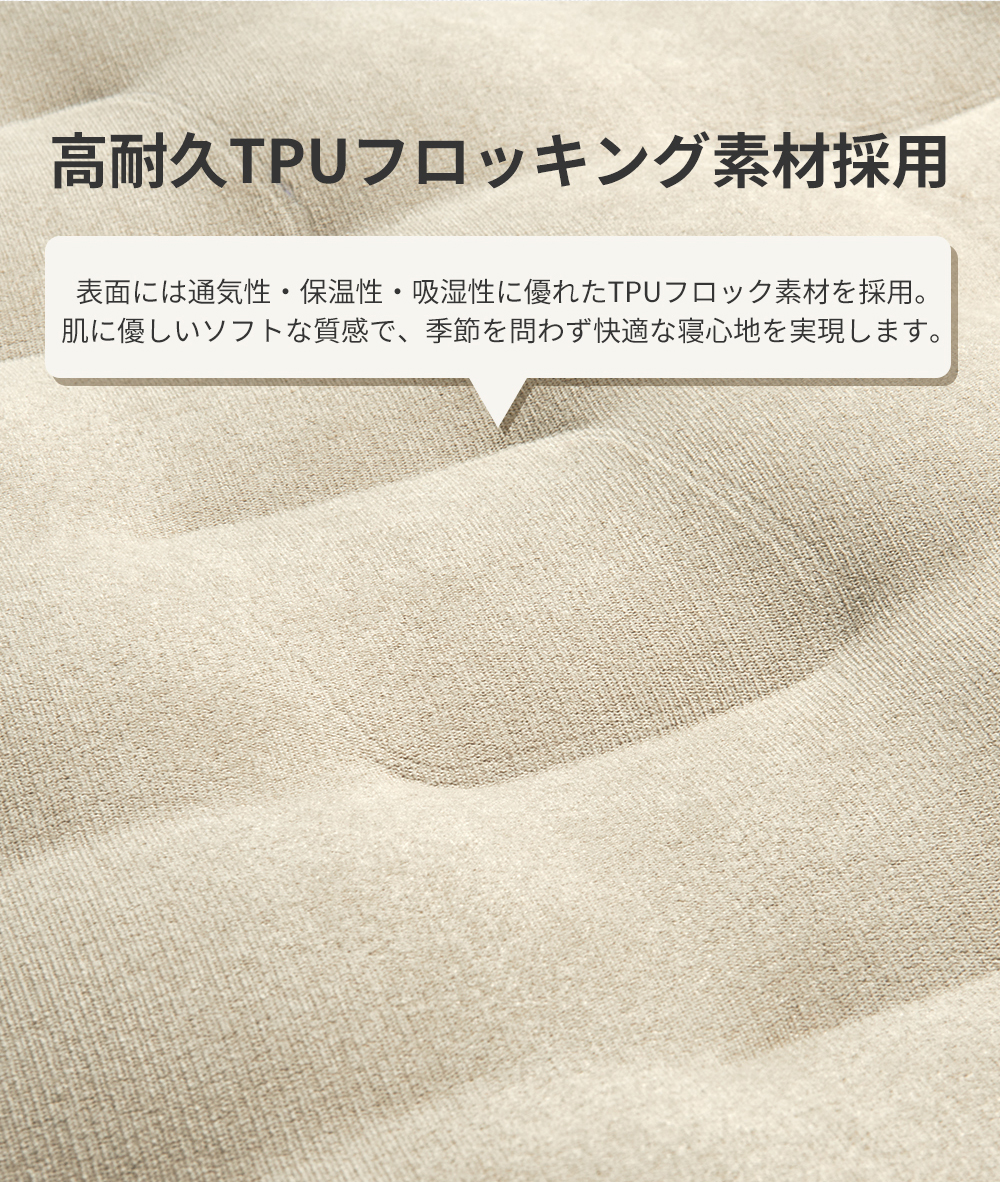 アウトドアでも、まるで自宅のベッドで眠っているかのような快適さ。 本製品は、極厚35cm・三層エア構造で、地面の冷気や湿気をしっかりシャットアウト。 さらに、体圧を分散する設計で衝撃を吸収し、優れた減圧・防振効果を発揮します。 地面からの温度や湿気を遮りつつ、ふかふかの寝心地をキープ。 体にかかる負担を軽減し、どんな姿勢でもリラックスできる極上の眠りへ導きます。 キャンプや車中泊、災害時の備えにもぴったり。 「アウトドアでもちゃんと眠れる」を叶える、快眠特化のエアマットです。