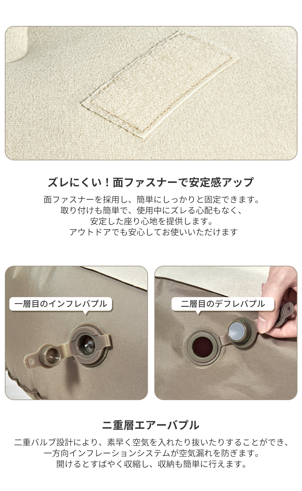 二層に分かれたエアバブル構造で、スムーズかつ迅速な空気の注入と放出が可能です。 一層目の一方向バルブは空気漏れを防ぎ、しっかり空気をキープ。 二層目のバルブは開くとすぐに収縮を始め、簡単かつ素早く空気を抜いてコンパクトに収納できます。 手間なく空気の出し入れができるので、アウトドアや移動時のストレスを大幅に軽減。 毎回のセッティングもスピーディーで、快適な使用感をサポートします。