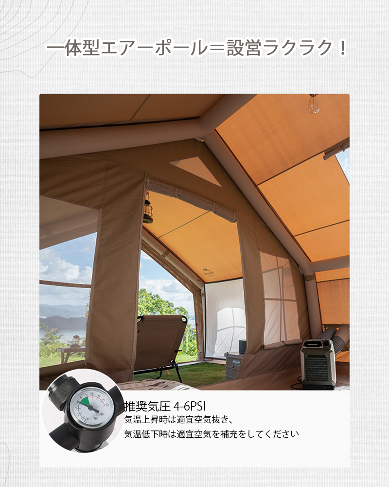 材質:600Dポリエステル(フライシート)、PVC(フロア)、ポリエステル(メッシュ)、PVC(エアポール)