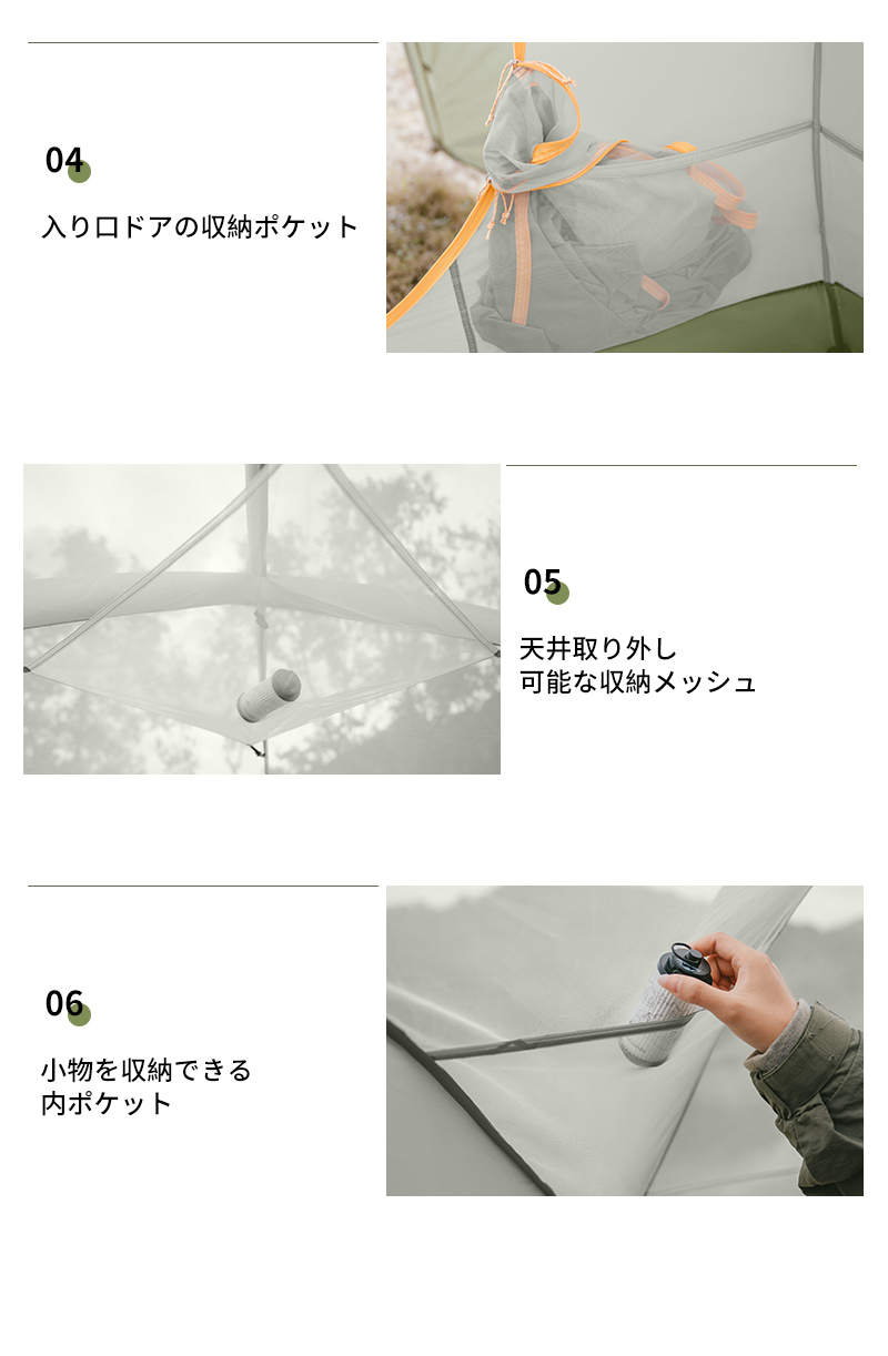 【細部まで丁寧に】スリーブ式はフレームを通すだけで難なく組み立てられました。インナーテントの3面に収納ポケットがあり、さまざまなサイズに対応できるため、キャンプ中に荷物が散らかったり紛失したりするのを防ぐことができます。天井には取り外し可能な収納メッシュ付き、キャンプライトや扇風機などを掛けられるフックが付いています。