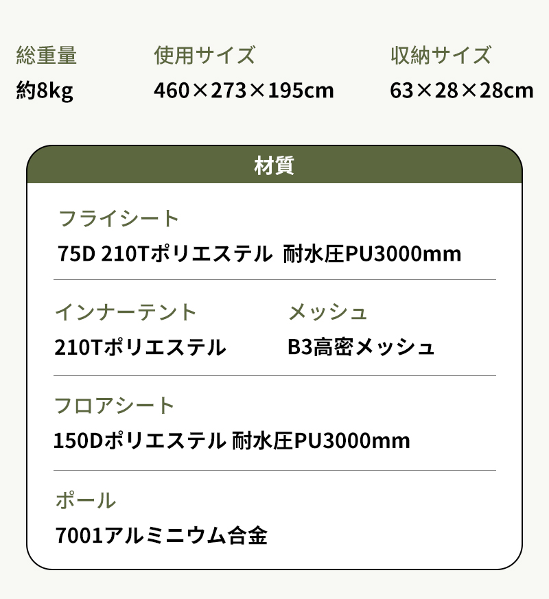 フライシート:75D 210Tポリエステル、耐水圧PU3000mm+