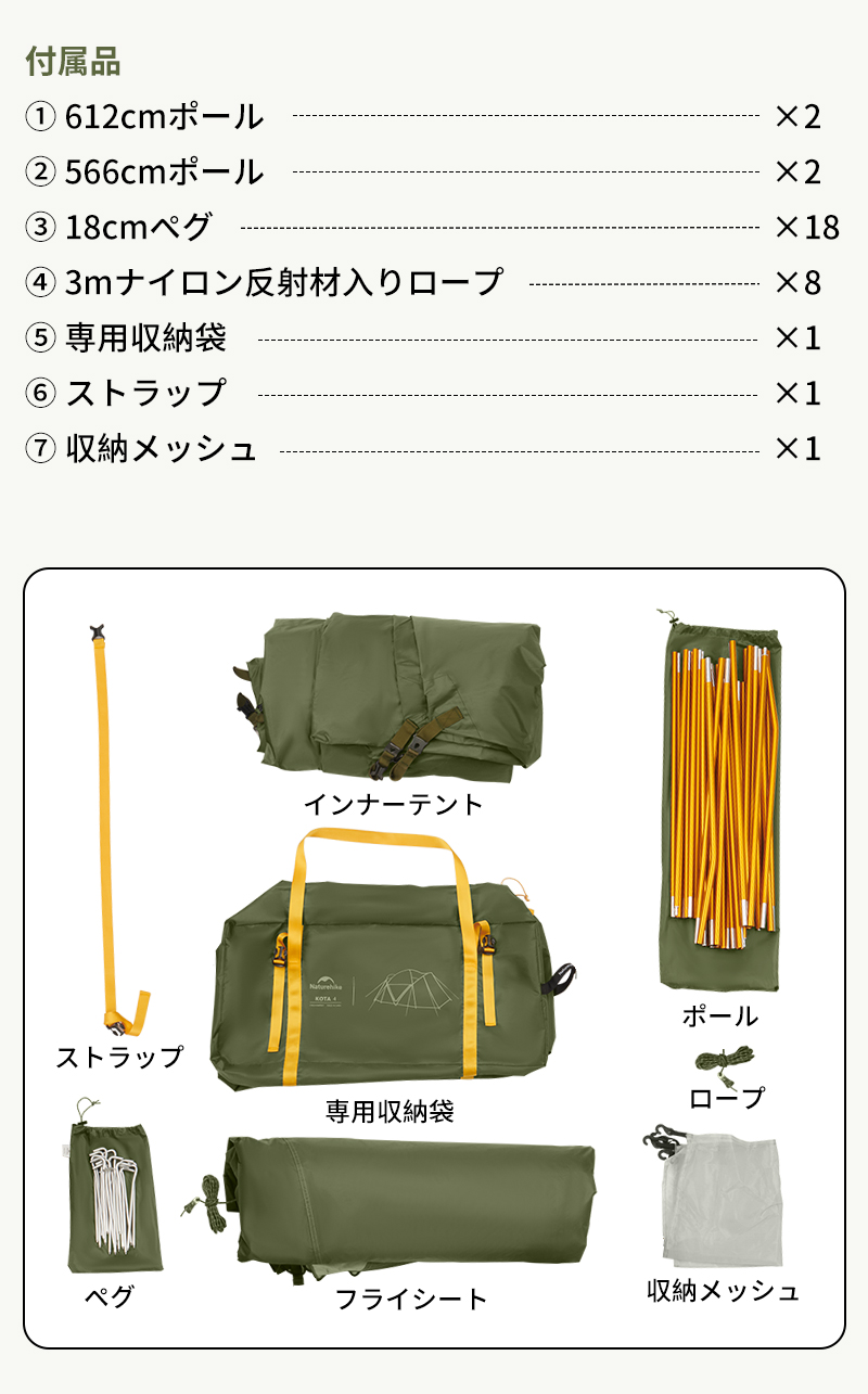ポール×4、ペグ×21、ロープ×8、ストラップ