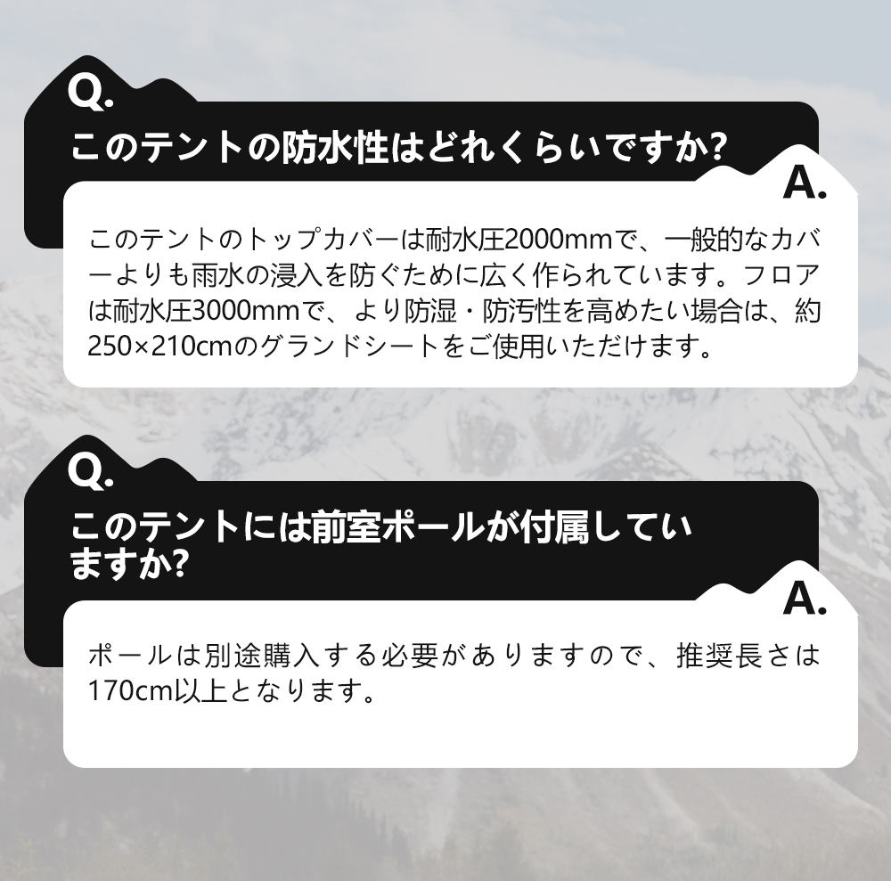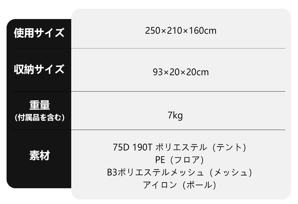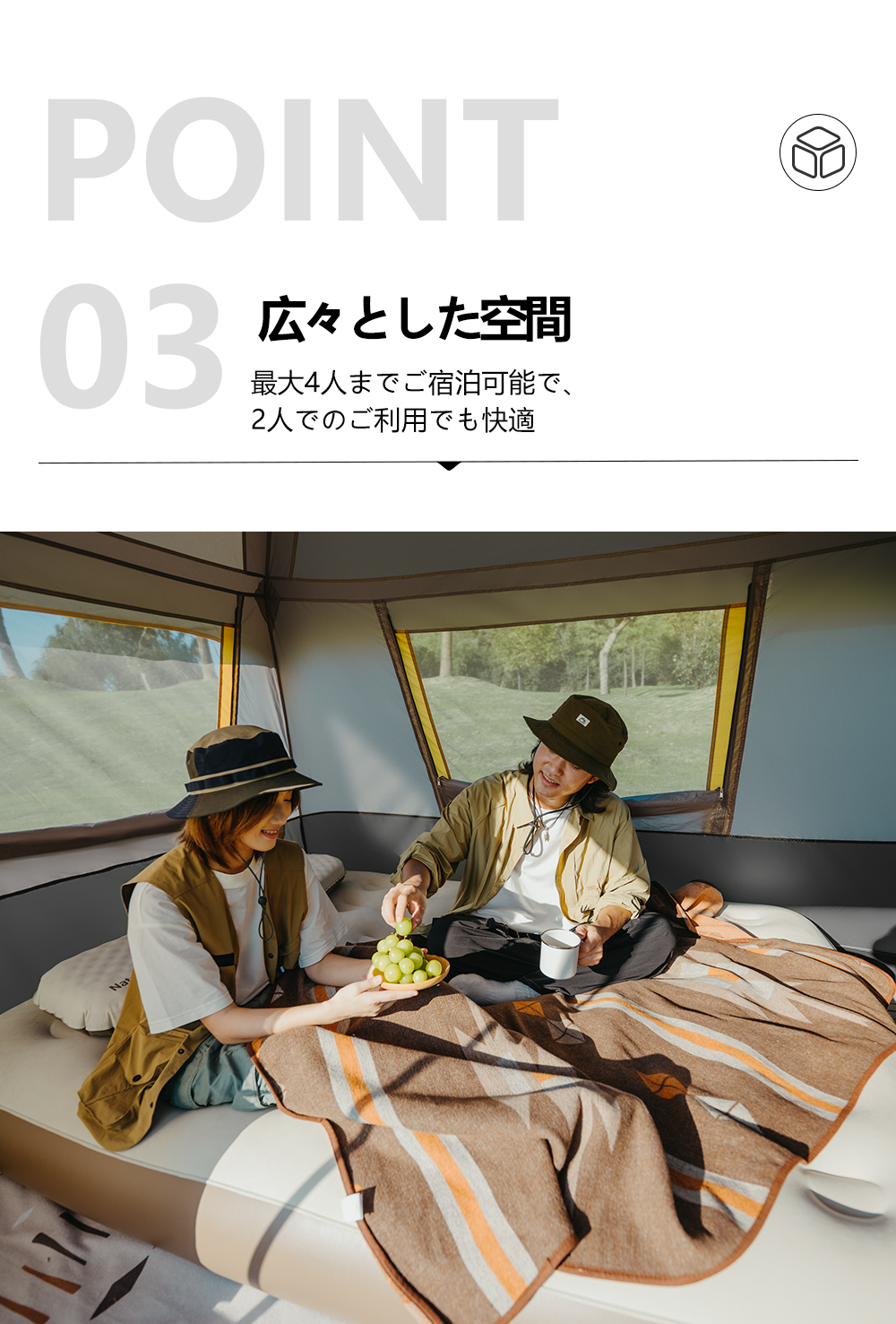 - 【広々とした空間】250x210x160cmの使用サイズは、2人で使用すると快適で、最大4人まで利用可能です。一家族がゆっくりキャンプを楽しむのに十分なスペースを提供します。内部は160cmの高さがあり、3つの大きな窓からの自然な換気や景色が楽しめます。