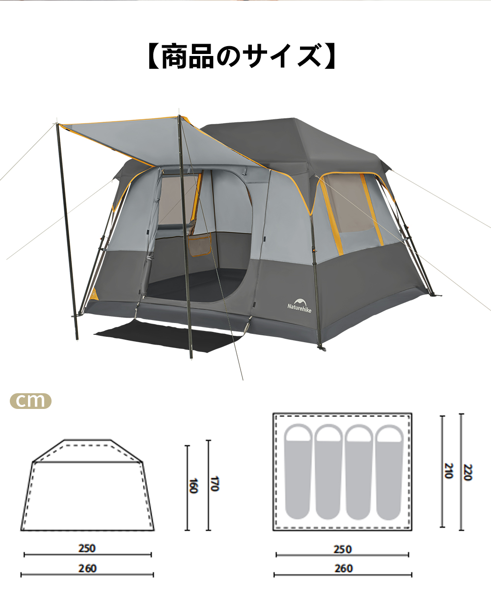 Naturehike Cape5.2 ワンタッチ テント 大型 2~4人用 ロッジ型 パークテント キャンプ 設営簡単 uvカット 自立式 2重層 耐水圧PU2000 初心者向け