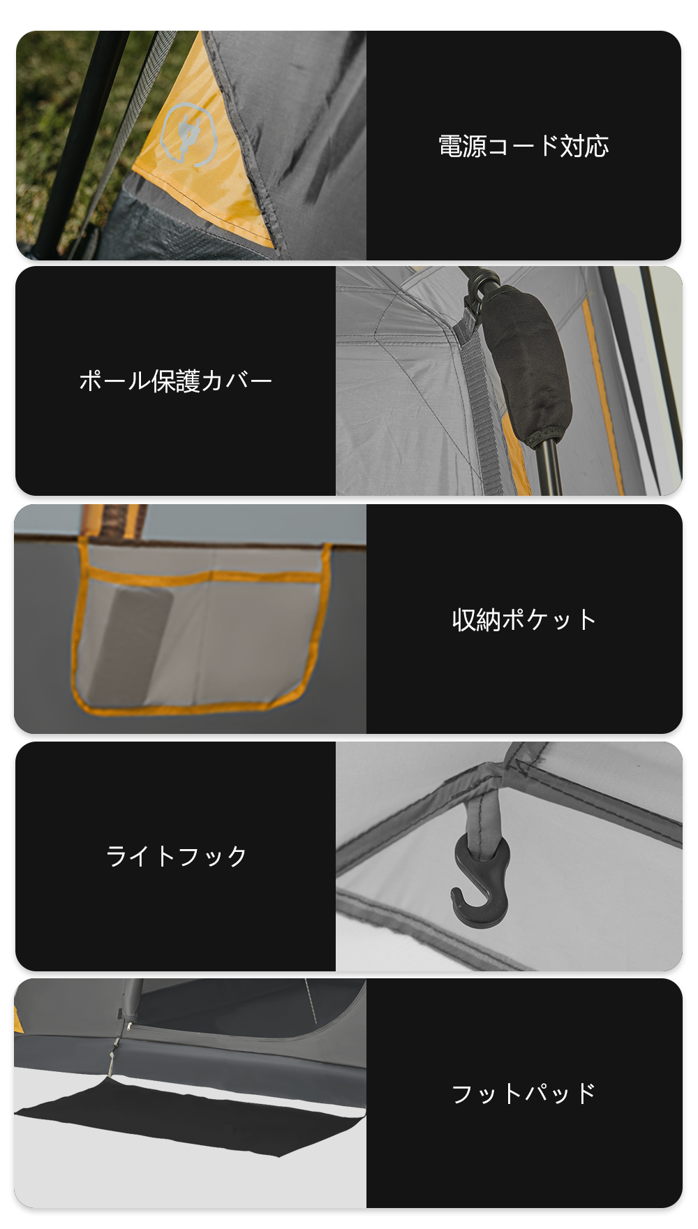 - 【詳細なデザイン】 電源コードを通す穴付属しているので、電源コードを取り外して電気製品を使用することができます。取り外し可能な収納バッグが付属しており、小物を入れて収納スペースを増やすことができます。テントトップにはライトなどを吊るせるライトフック付きます。