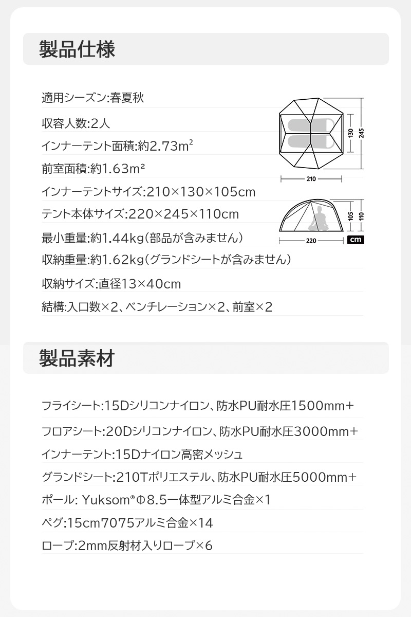 フライシート:15Dシリコンナイロン、防水PU耐水圧1500mm+