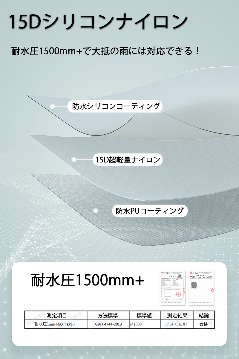 フロアシート:20Dシリコンナイロン、防水PU耐水圧3000mm+