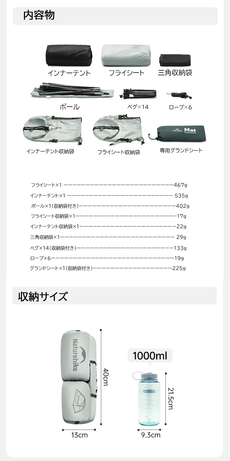 フライシート、インナーテント、グランドシート、ポール、ペグ×14、防風ロープ×6、フライシート収納袋、インナーテント収納袋、三角収納袋