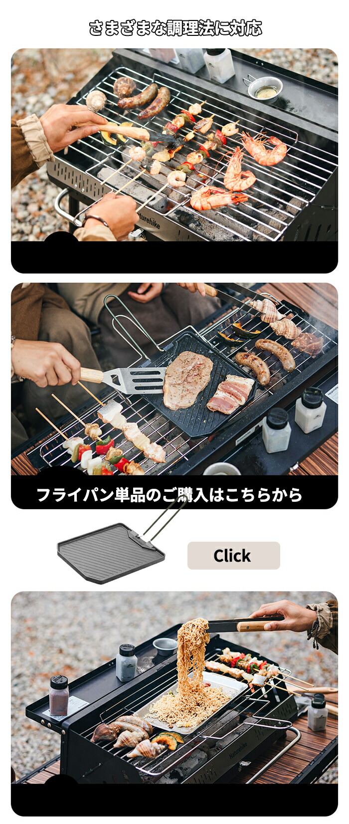 4、ソロキャンプ、ファミリー、ロースタイル、ハイスタイル、卓上バーベキュー、収納ラック、サイドテーブルなど、用途に合わせて、屋内・屋外を問わず使える汎用性の高い。