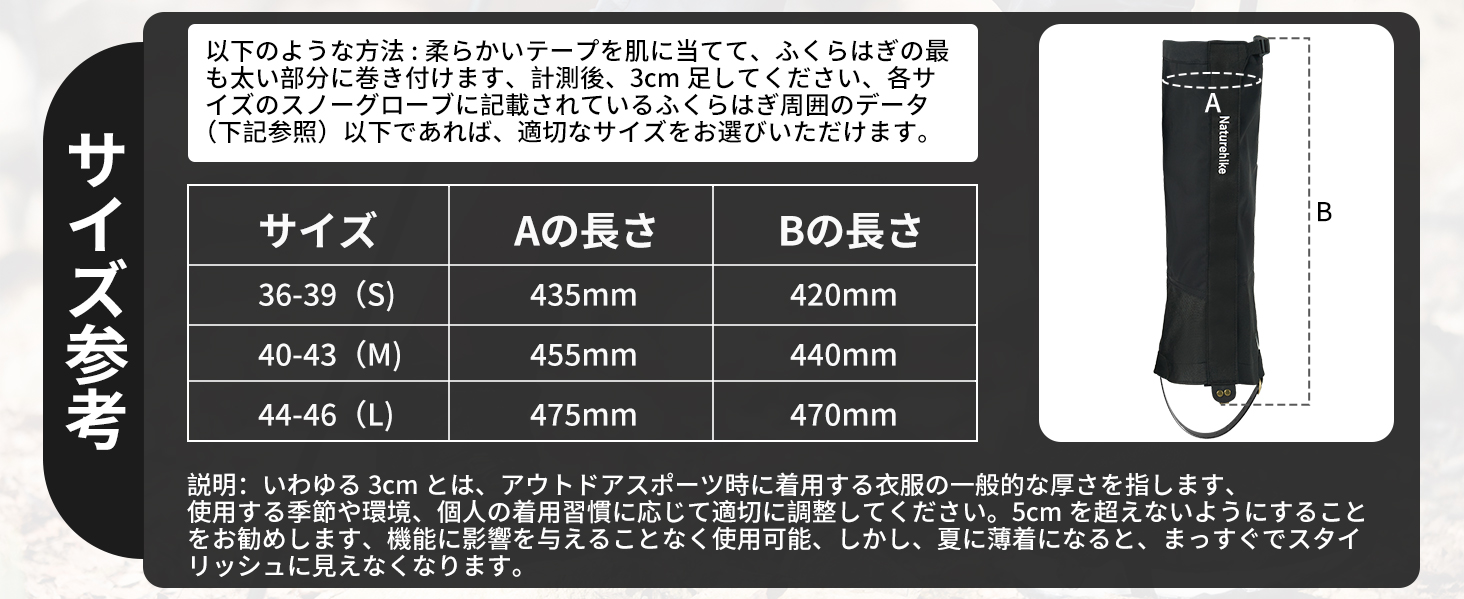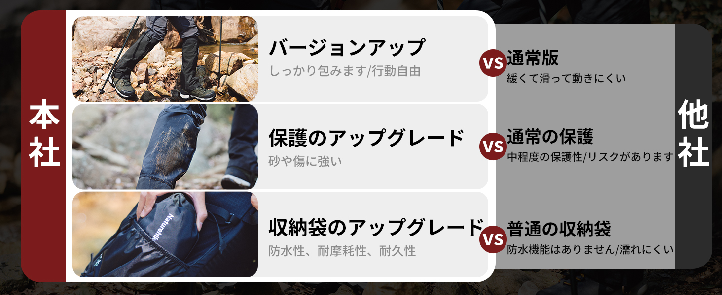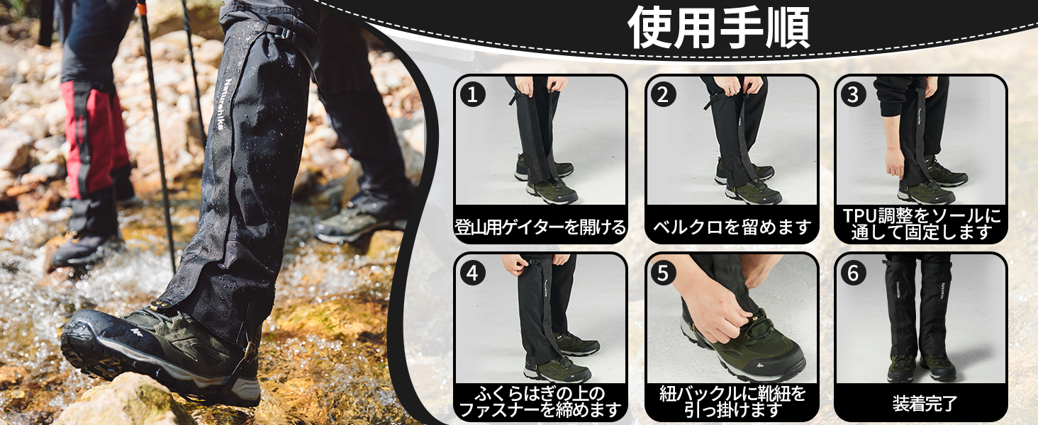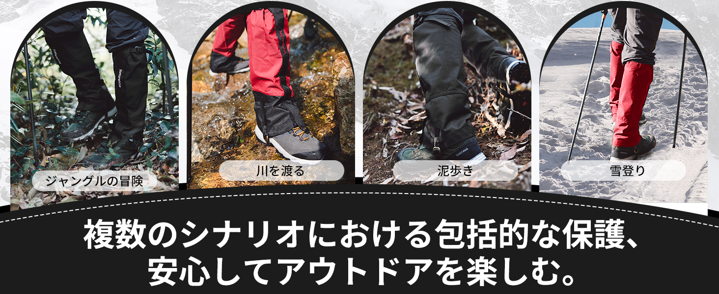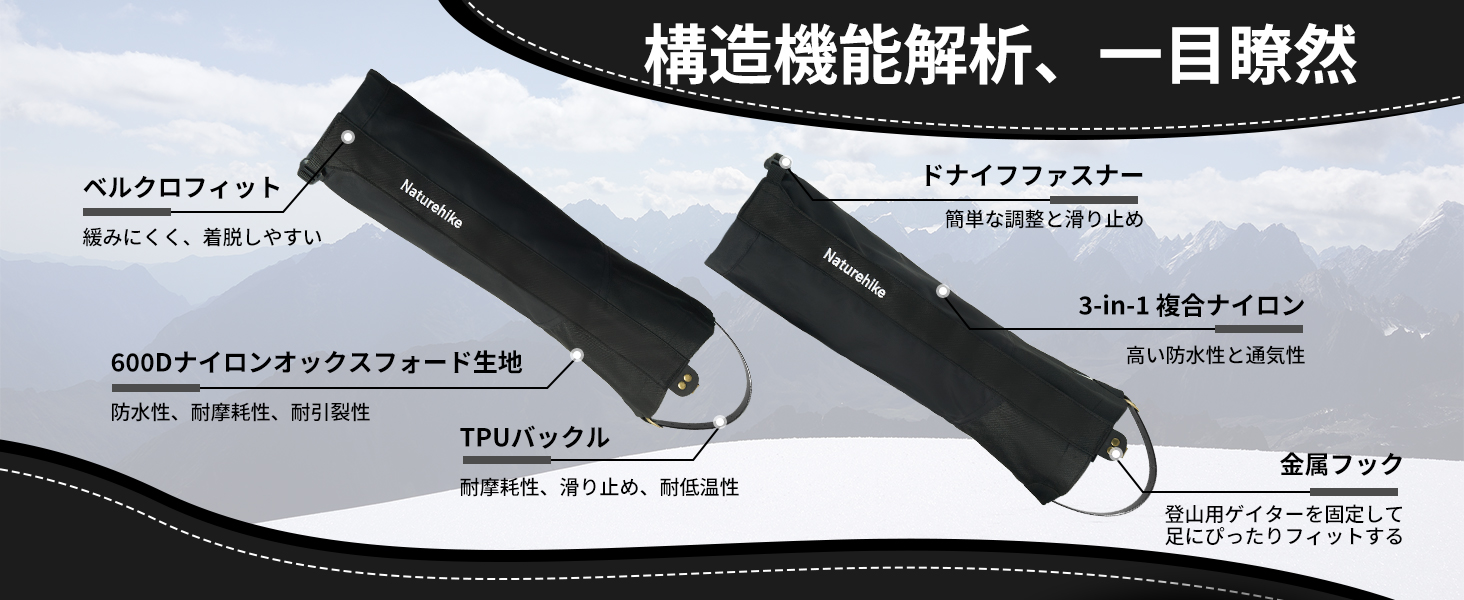 【防水軽量】ネイチャーハイクの登山用ゲイターは上部の3層複合ナイロン、防水生地を採用し、耐水圧10000mmH20以上で、雨や雪の侵入や足元の汚れを効果的に防ぐことができます。優れた耐水性・防塵性と最大限の通気性を高次元で両立させています。晴れた日でも砂や小石などが靴の中へ入るのを防ぎます。
