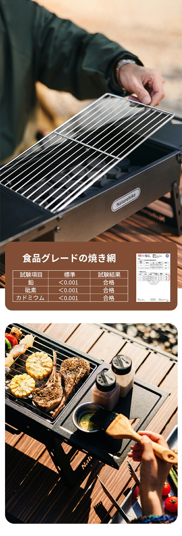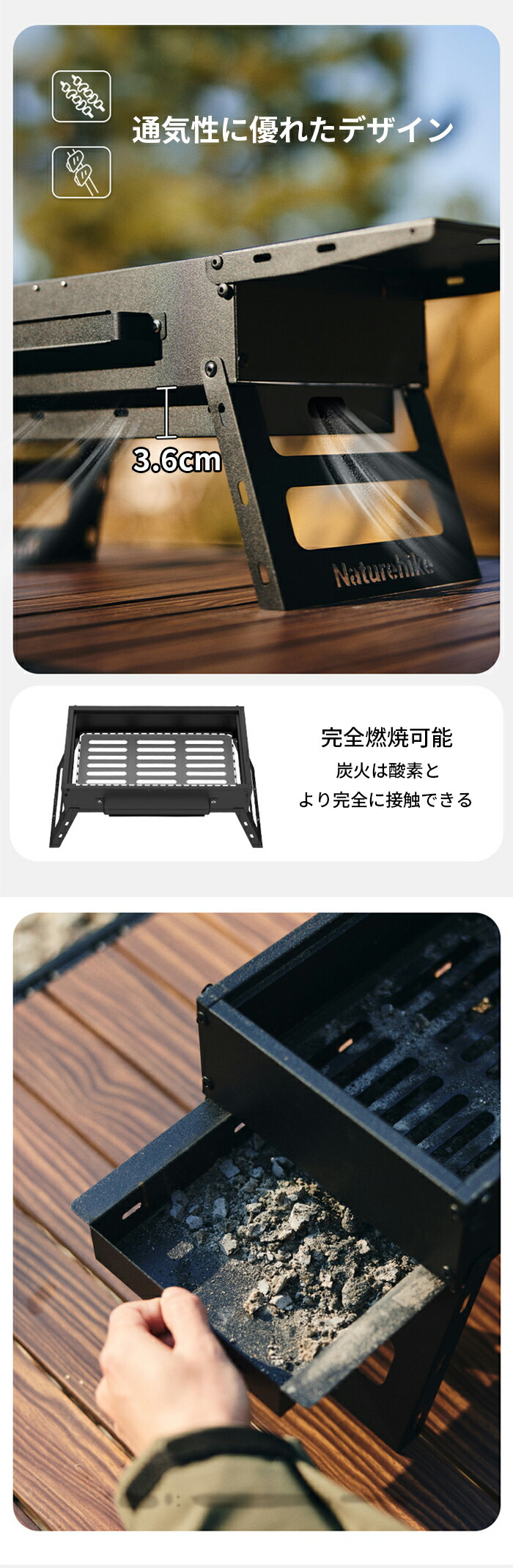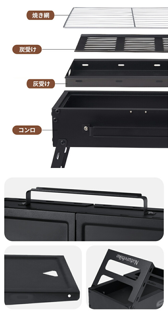 3、掃除を楽にする、焼き網、炭受け、灰受けは取り外し可能で、お手入れが簡単、表面に油汚れがなく、拭くだけできれいになる。