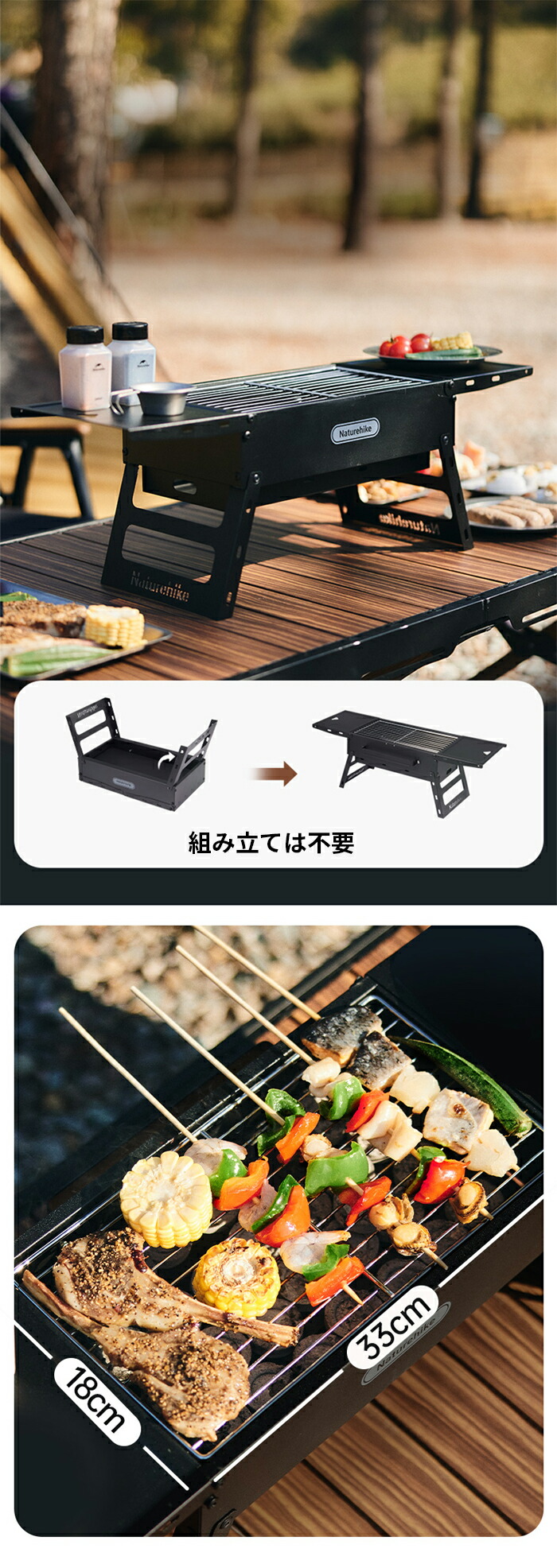 2、コンパクトサイズのテーブルトップグリル、テーブルに置いても邪魔にならない、焼面サイズは約33x18cm、一度にたくさんの食材を焼け、1~3人対応できる。サイドに厚みのある板があり、調味料などの小物も収納でき、キャンプをより楽しめます!安全