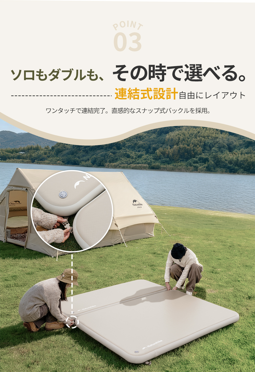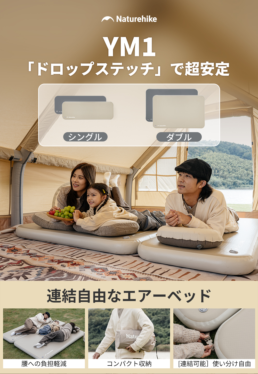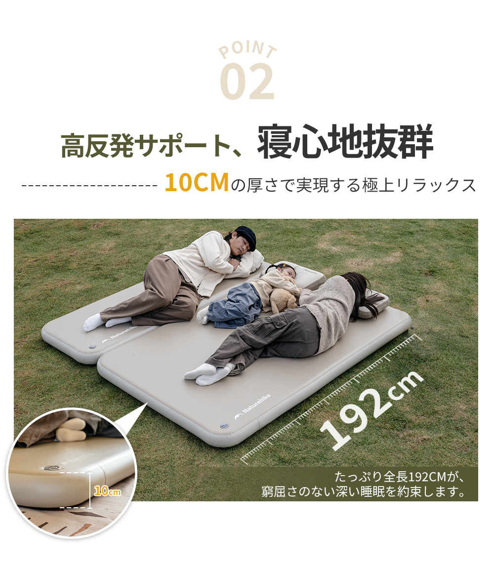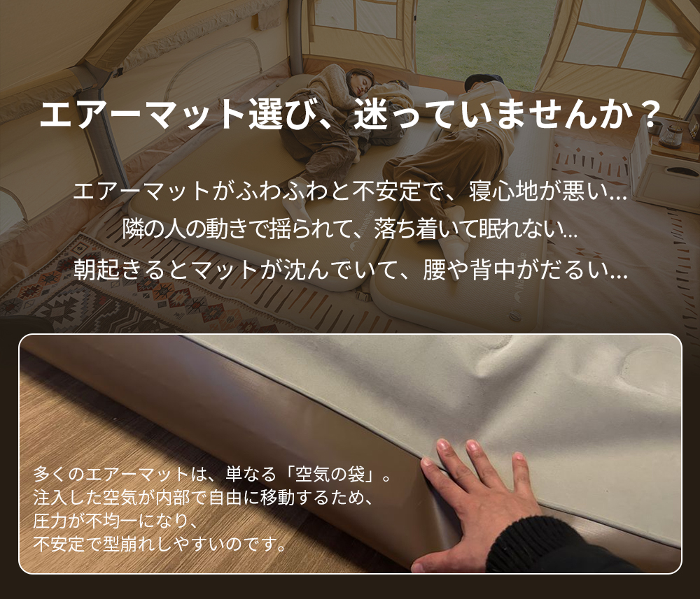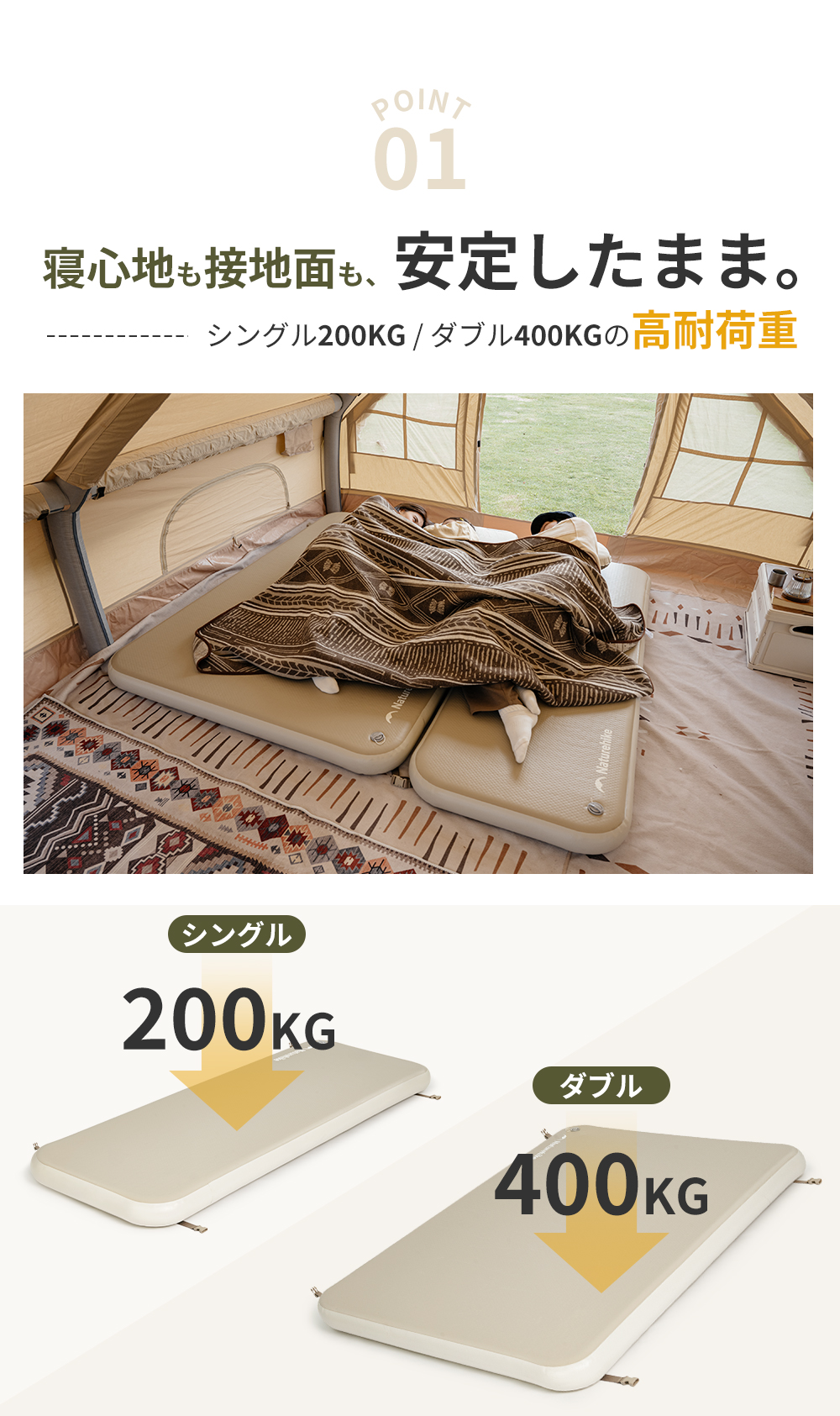 【抜群な寝心地】構造が安定で荷重は約400kgに達します(1人用200kg、2人用400kg)。一体型サポートで、沈み込みを防ぎ、より安定したサポートで自由に寝返りができ、 極上の快適さで一日の疲れを癒します。