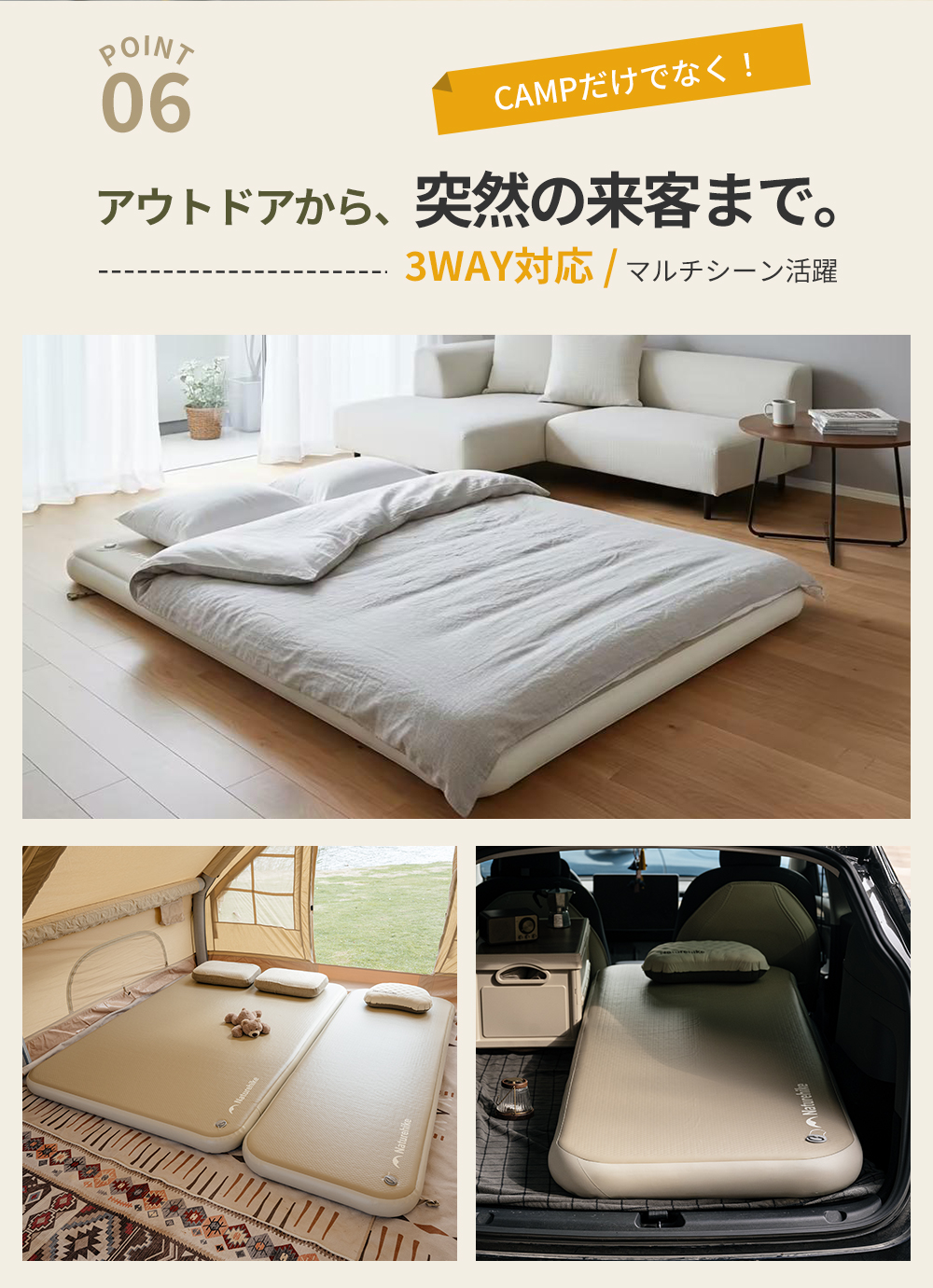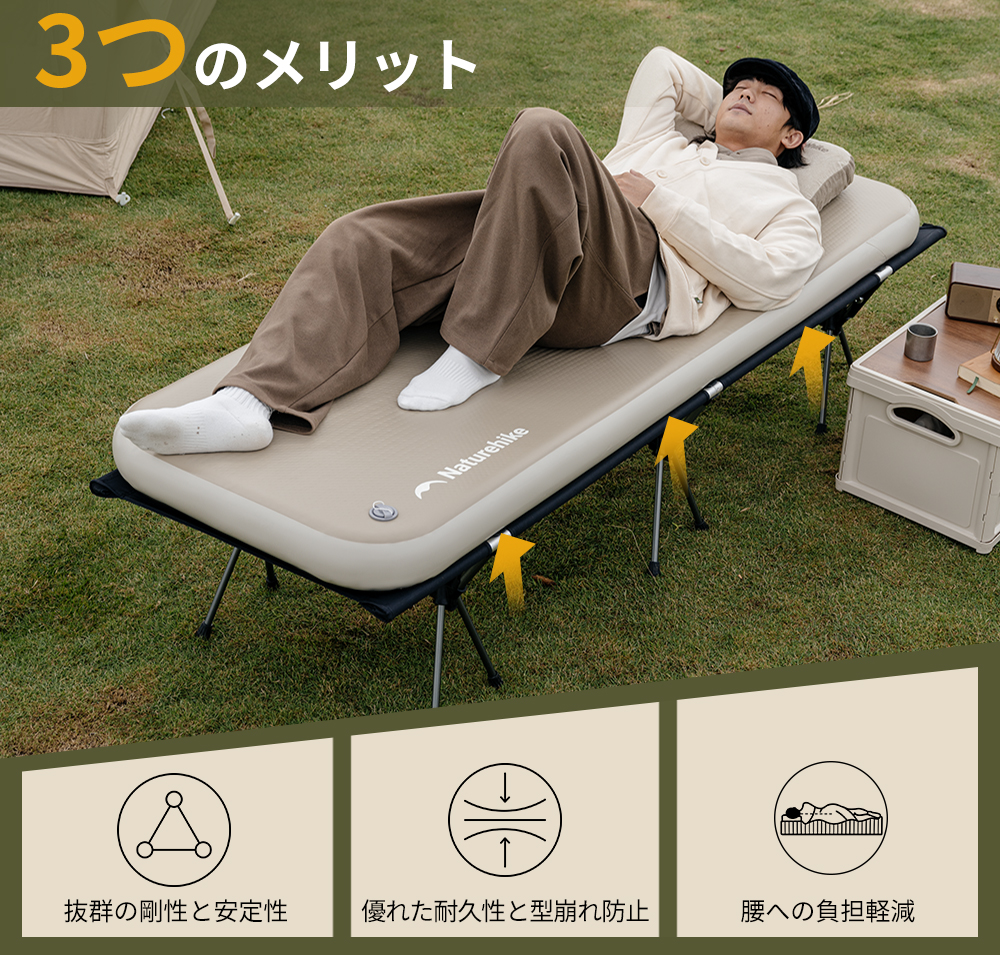 【様々なシーンに適用】キャンプだけではなく、家庭では普段ご使用のベッドのほかに、急な来客があっても、すぐにベッドとして提供することができます。地震や災害が発生した場合の防災グッズとしてもおすすめです。