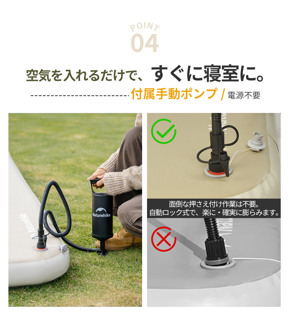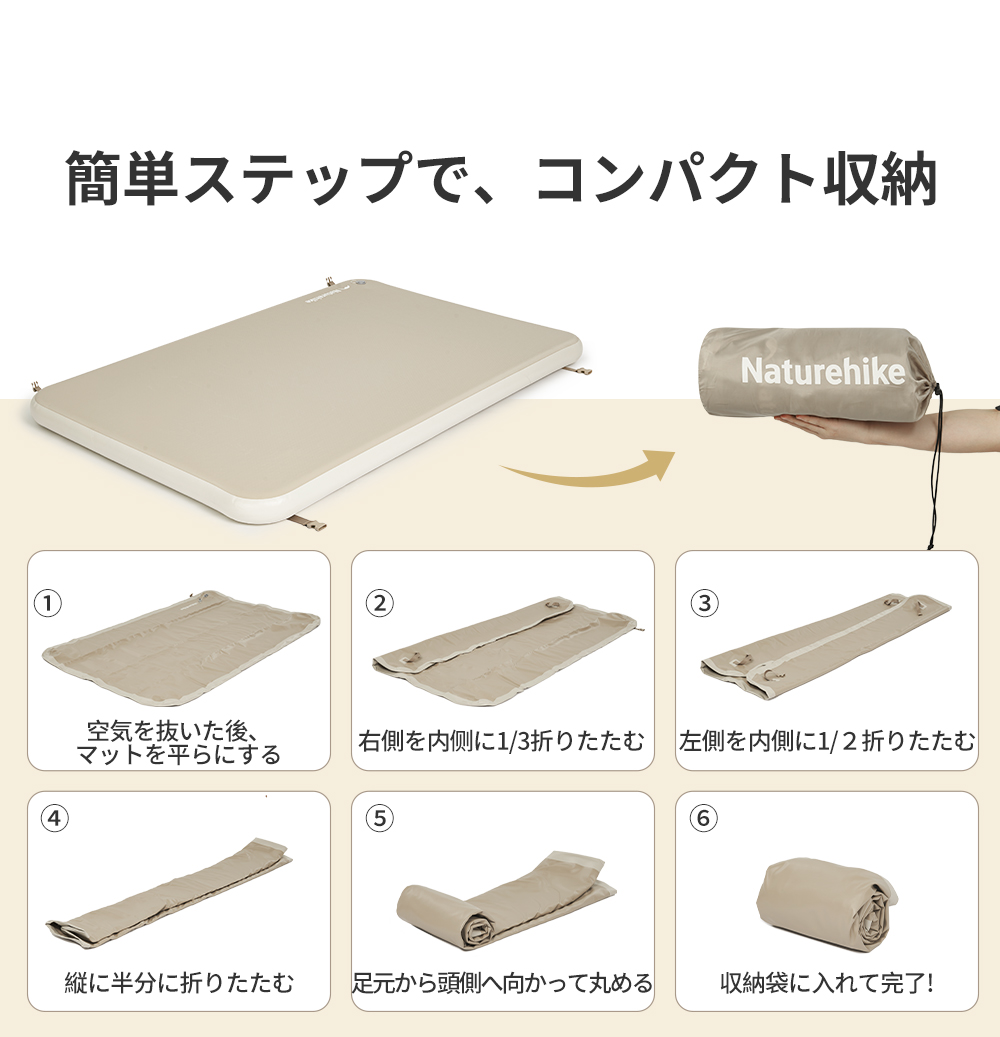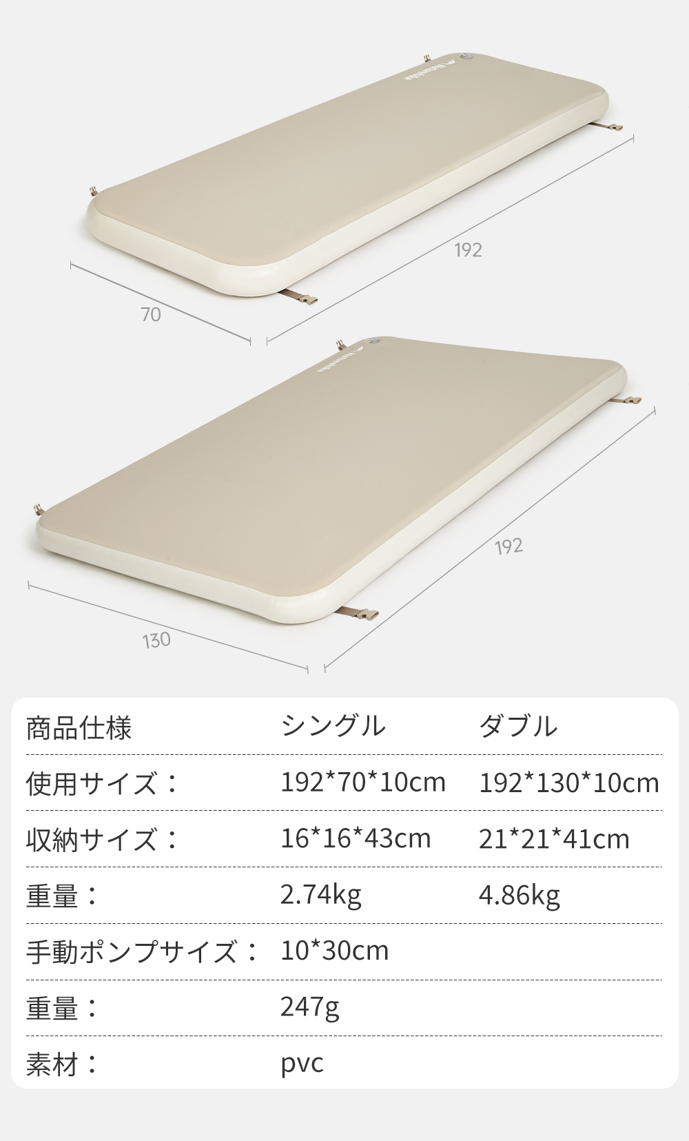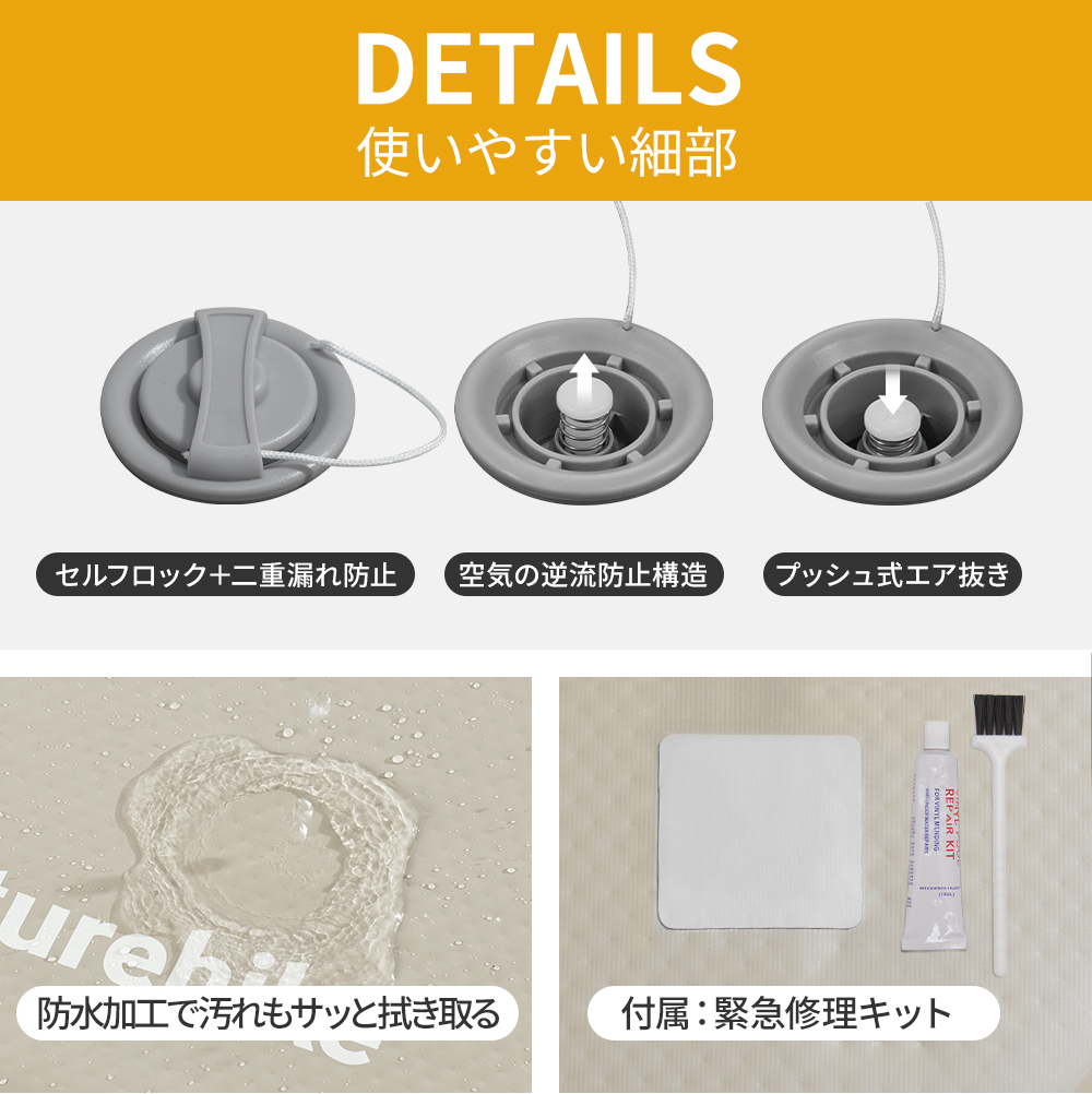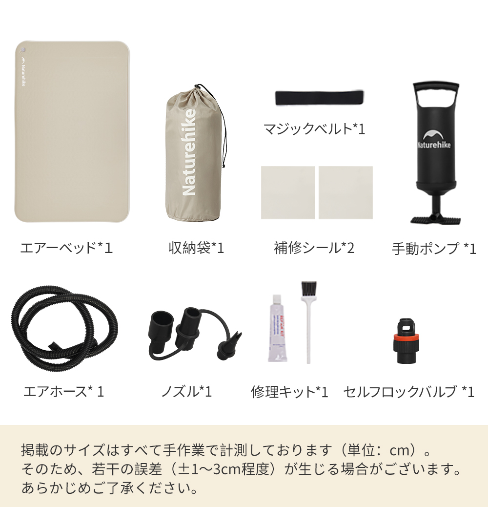 梱包内容:エアーベッド×1、収納袋×1、補修シート ×2、補修キット ×1、手動ポンプ ×1、エアチューブ ×1、ノズル ×1、セルフロックノズル ×1、結束バンド ×1