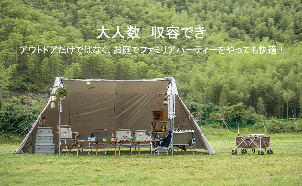 ファミリーキャンプ、パーティーなど8人収容しても余裕がある大きいスペース。