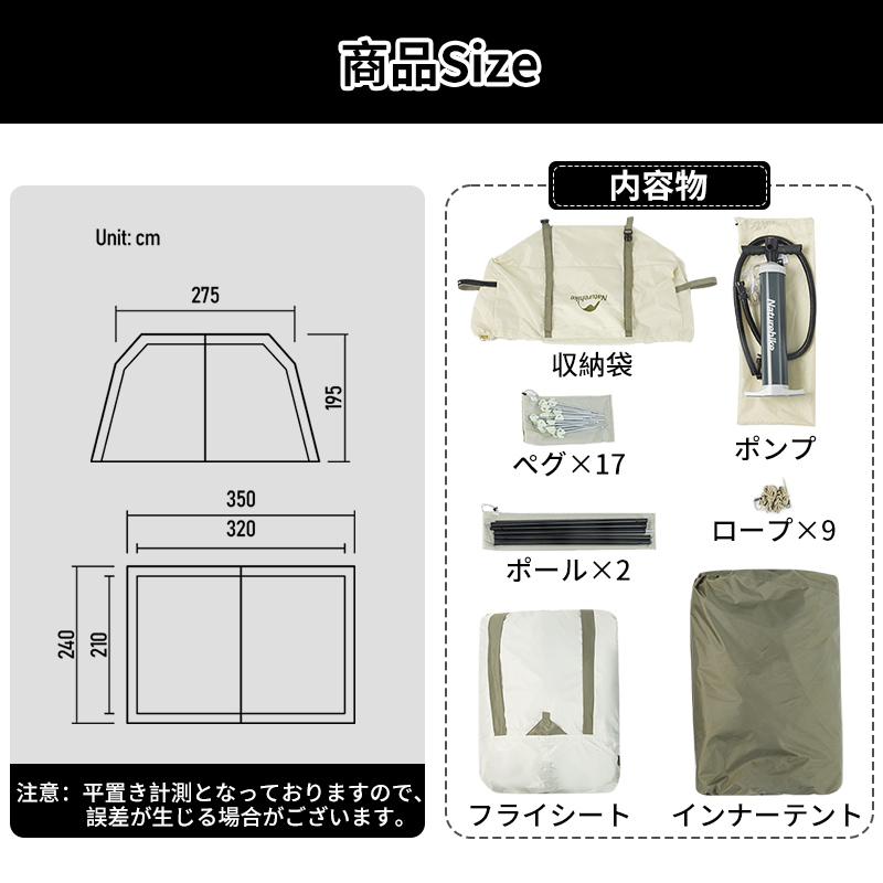 | セット内容 | フライシート×1 インナーテント×1 ポンプ×1 ポール×2 ペグ×17 防風ロープ×9 梱包バンド×2 |