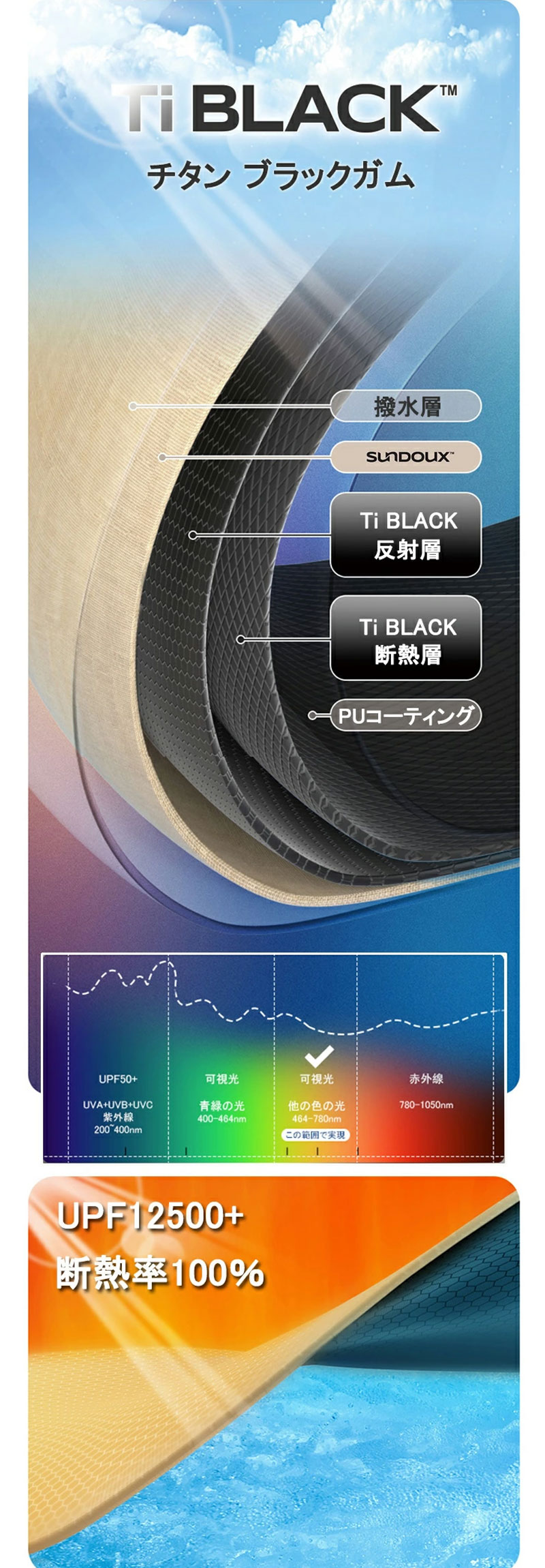 3、フライシートとキャノピーにはチタン ブラックガム(Ti BLACK)生地を採用し、シルバーコーティングよりも遮熱性が高く、ブラックガムコーティングよりも軽量です。5層の日焼け止めと防水設計を備えており、UPF12500+を達成できます。