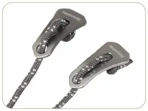 自社開発の自在付きロープ用ロックピース自社開発した湾曲デザインのロックピース、自在付きロープの摩耗を軽減し、耐久性を向上させる。 |