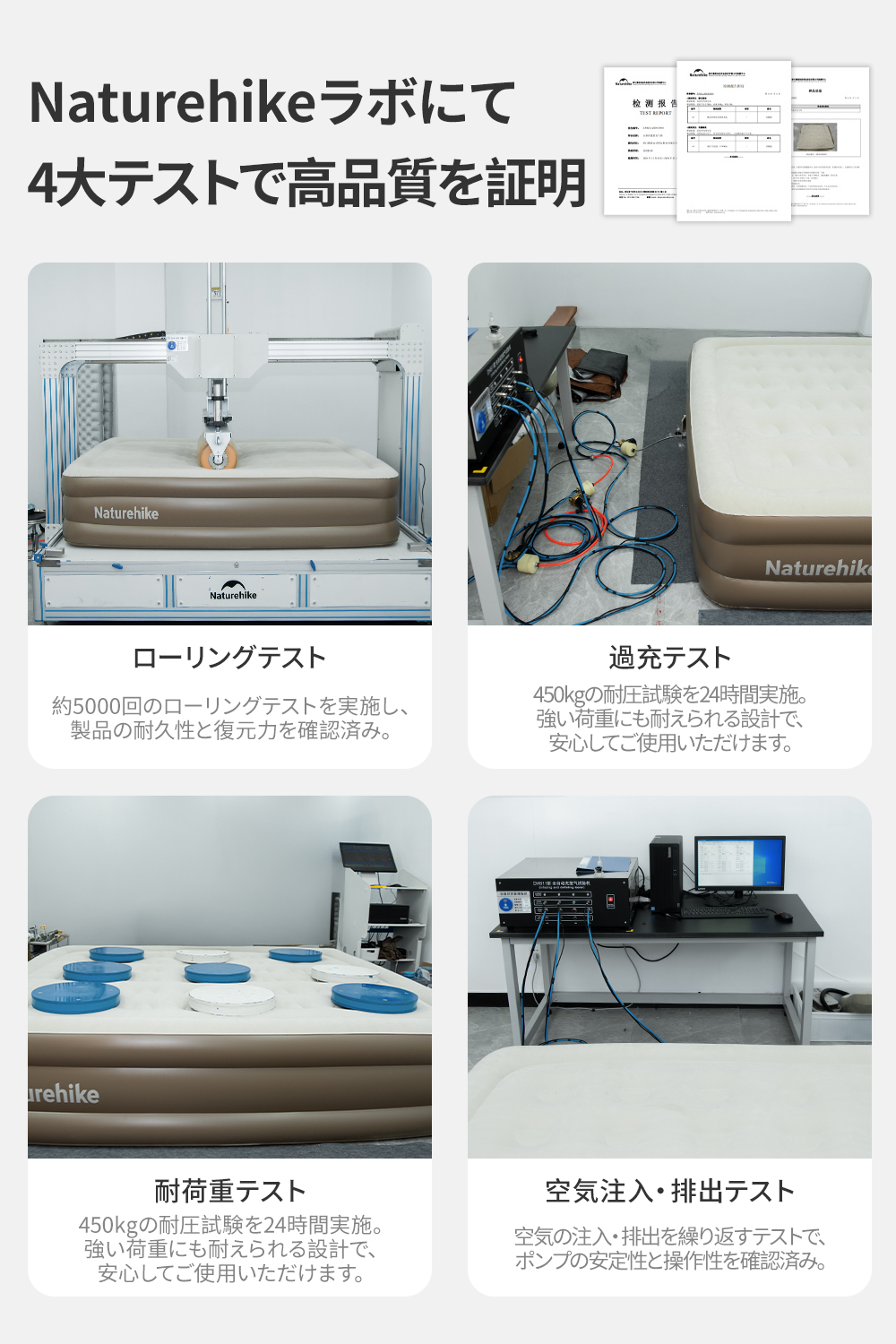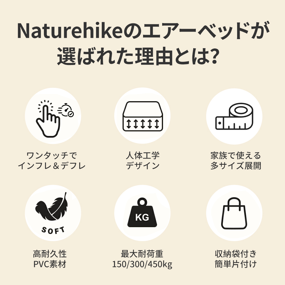 - 【 ワンタッチ操作】アップグレードされた電動ポンプを搭載したネイチャーハイクのエアマット。別途ポンプ購入不要で、1 分 30 秒で完全充満(※1 人用サイズ)!直感的なワンタッチ操作で、複雑なモード切替えの悩みを解消。Type-C 充電対応で、携帯充電器やモバイルバッテリーでも簡単給電可能。キャンプ時の早朝設営や夜間の簡易充電もスムーズに実現します。