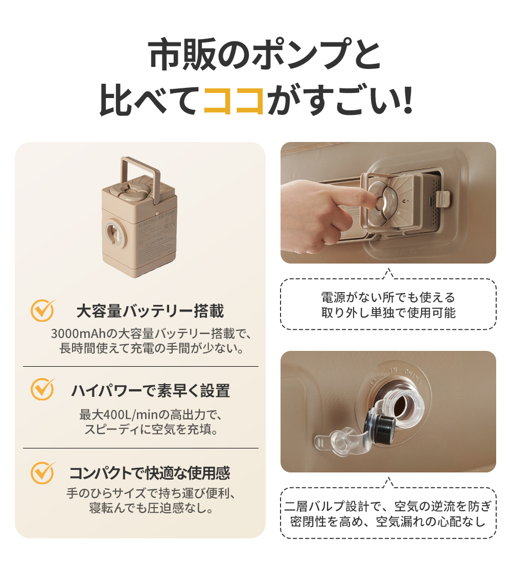 - 【キャンプから家庭まで、多用途対応】野外でのテント泊だけでなく、自宅のゲストルーム、災害時の避難用ベッド、リビングでのお子様遊び場にも最適!取り外し可能なポンプは、エアピローやエアマットレスなど他のキャンプ用品の充放気にも利用でき、道具を効率的に使い分けられます。日本の四季を問わず、快適な空間を手軽に作り出せます。