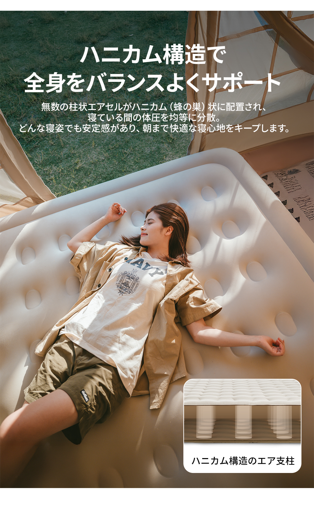 - 【人間工学設計 ×450kg 耐荷重】蜂の巣状エア柱構造により、体重を均等に分散し、腰や肩の圧迫を軽減。厚み 25cm のクッション性素材が体をしっかり包み込み、野外でもベッド同等の快適睡眠をサポート。1 人用 150kg/2 人用 300kg/3 人用 450kgの高荷重に対応し、家族や友人とのツーリングにも安定した支持力を発揮。収納時はコンパクトなサイズ(直径 25cm× 長さ 50cm)で、車のトランクやリュックにもスッと入れられます。
