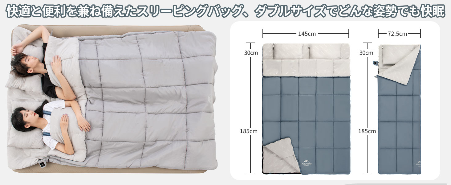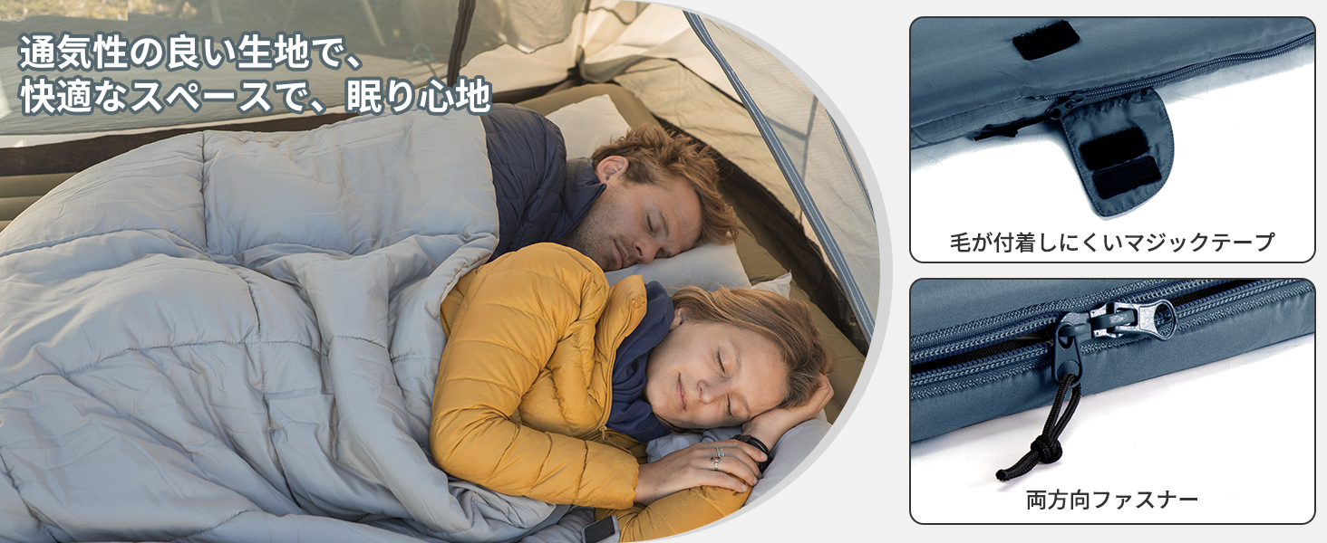 - 【連結解体可能・2人用】連結、解体可能な仕様で、分かれても連結しも利用でき、カップルや2人家族、親子、仲良い友達など揃ってお使いできます。分割して開いたまま掛け布団としても活用されます。また、ダブルファスナーを採用し、外側からも内側からも開閉可能で、自宅洗濯機で手軽に洗濯でき、利便性が高いです