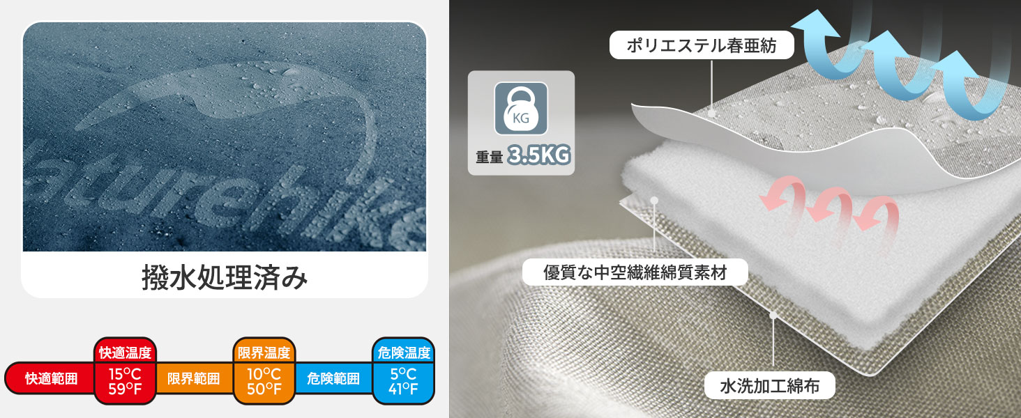 - 【快適な寝心地】裏地も中綿も肌に優しいコットン素材を採用し、柔らかくて肌に馴染やすく、肌がデリケートな方でも安心してお使いできます。通気性や吸汗性にも優れ、湿気や汗などスムーズに発散され、サラサラと快適な寝心地を楽めます。表地はポリエステル素材に撥水加工を施し、露のある環境でもじめじめした感じがなく、お手入れも便利です